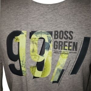 BOSS Green Togn 2 Long Sleeved T Shirt In Grey. A cotton jersey t shirt with a crew neck and long sleeves. A large abstract graphic design is printed on the chest in black and lime with the signature BOSS Green logo printed on the left of the chest within the design. Logo printed on back of neck as well.