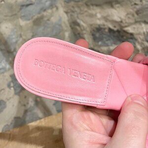 Bottega Veneta Blossom Pink Leather The Rubber Lido Heeled Sandals. Light pink leather upper. Slip-on style heels. Open square toes. Thin heels. Pink leather insoles. Made in Italy. Come with the original box and dustbags.