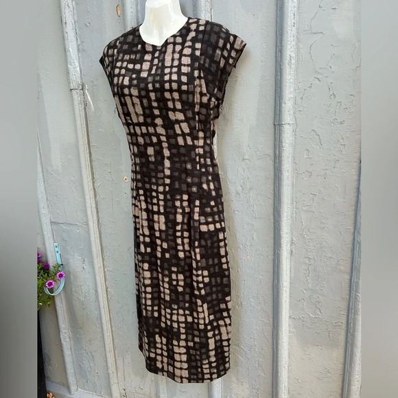 Beautifully tailored feminine lines with this form fitted sheath dress. Abstract pattern, feminine lines with tailored seams to allow for a form fitted look.
