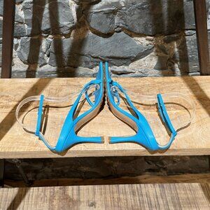Smooth leather in a bright sky blue. Featuring a square toe, a flared heel, and slim leather straps over the front and wrap around the ankle with an adjustable gold-toned buckle closure. Leather insole and leather outsole with rubber treads. Made in Italy. They come with a Bottega Veneta dustbag.