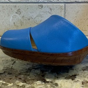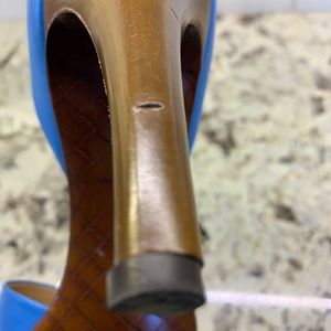 Worn once, super soft leather with no seams. Signature woven soles with a tiny mark in once back heel and one heel lift is slightly crooked. Heel is 4 inches and insole measures 10.5 inches. Authentic - purchased by me in California. Heel pads in back are from the store and easily removed.