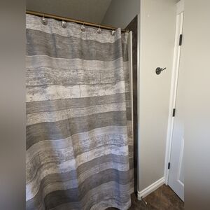 NWOT Bouclair gray scale cloth shower curtain with 12 silver grommets. New high quality Liba USA liner with paper packaging.