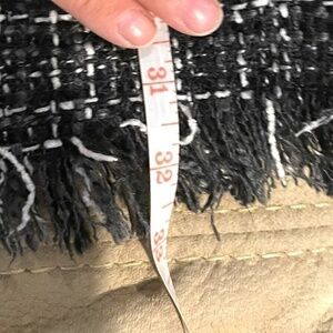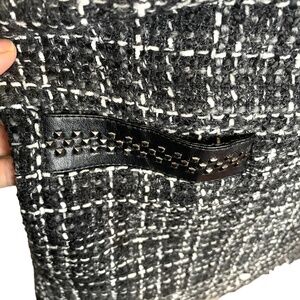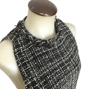 Beautiful boucle dress with back zipper and elongated armholes. Stylized pleather welt pockets with studs and raw edges.