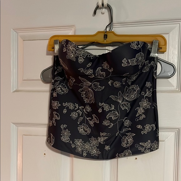 Elegant black strapless top with floral design. Perfect for a night out.