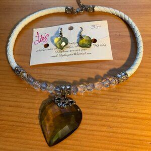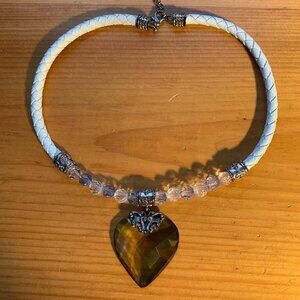 The necklace materials are white faux leather braid on the back third, accented with glass and gold-coloured beads leading up to the heart-shaped, green faceted stone at the front