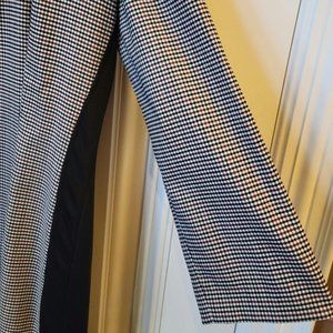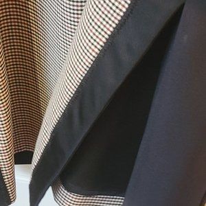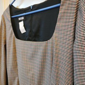 Boutique Moschino, BWT, Size 12, fully lined, wool blend, Black panelled with a small check pattern, square neck detailing for a flattering look. Back of dress is solid black and has a long zipper. Vent on one side of the dress, 3/4 length sleeves. Black panels at both sides provide a slimming effect.