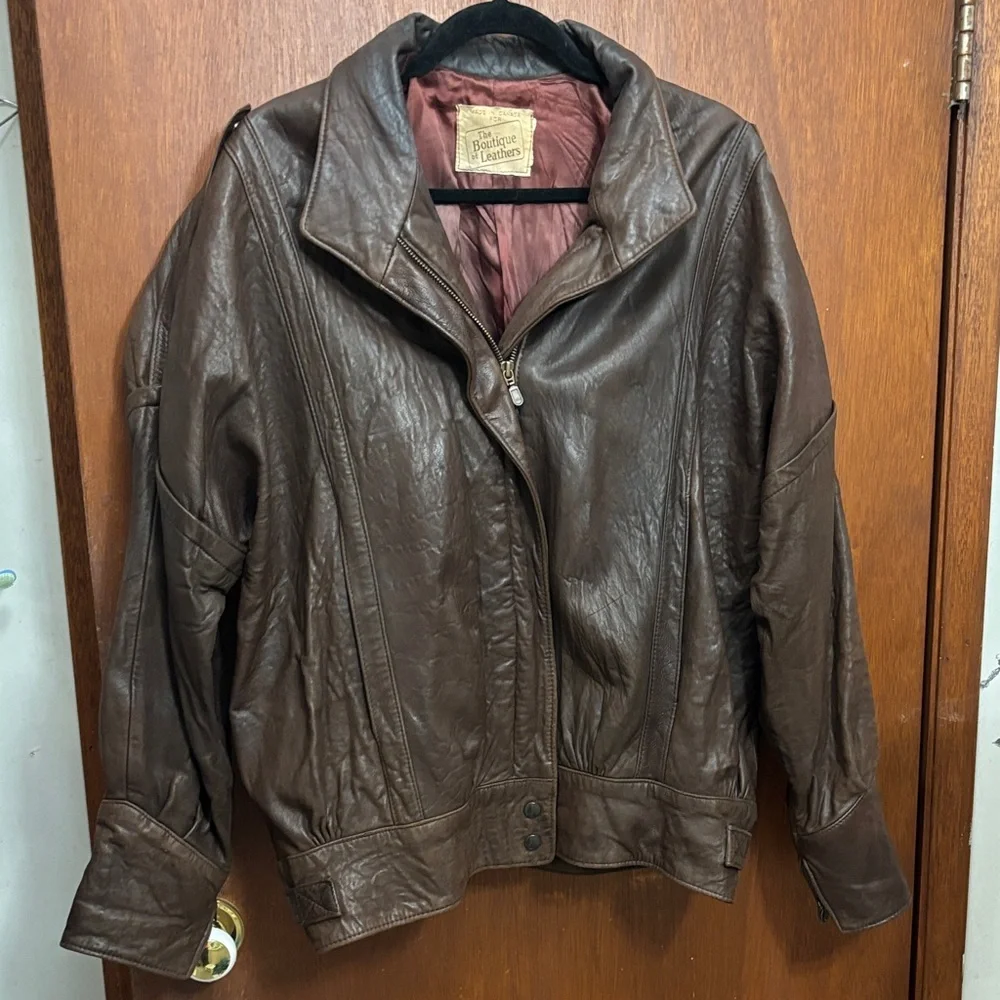 Rich brown leather jacket. Features a wide collar and zip closure. Perfect for casual or dressy occasions.