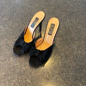 Rotelli brand, I can’t find a size but they fit like an 8. They’re velvet, so are in EUC (they don’t actually look like they’ve been worn) but could use a lint roll. 4” heel.