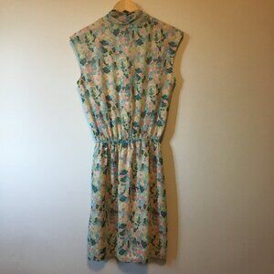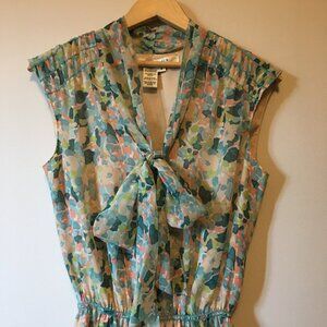 Very good preowned condition, ruched shoulder, elasticized waist, breezy-material sleeveless dress by Max Studio featuring an almost camo like floral pattern in cyan, teal, coral, and greens. Almost like a pointillist painting. So pretty.