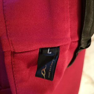 Red skirt, twill weave with slight sheen. Side zipper. Two large box pleats on front and two on back. The tag says Large but it's really more of a medium.