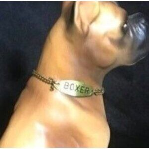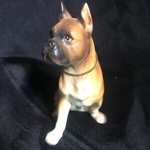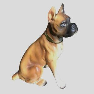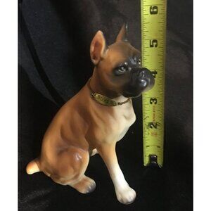 This Unbranded Vtg Brindle Tan Boxer Dog Figurine, crafted from ceramic, hails from Japan. It features a collar, standing 5 3/4" tall, perfect for collectors and dog lovers alike.