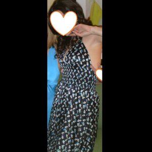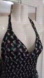 Halter tie neckline, smocked elastic midsection, bubble hem skirt, sewn-in inner black lining