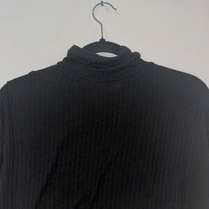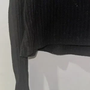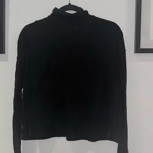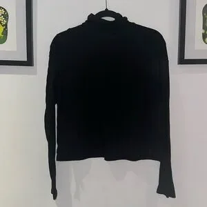 Cute boxy cropped turtleneck. Back is about 1 inch longer than the front and has a split detailing on each side. Ribbed pattern throughout the material.