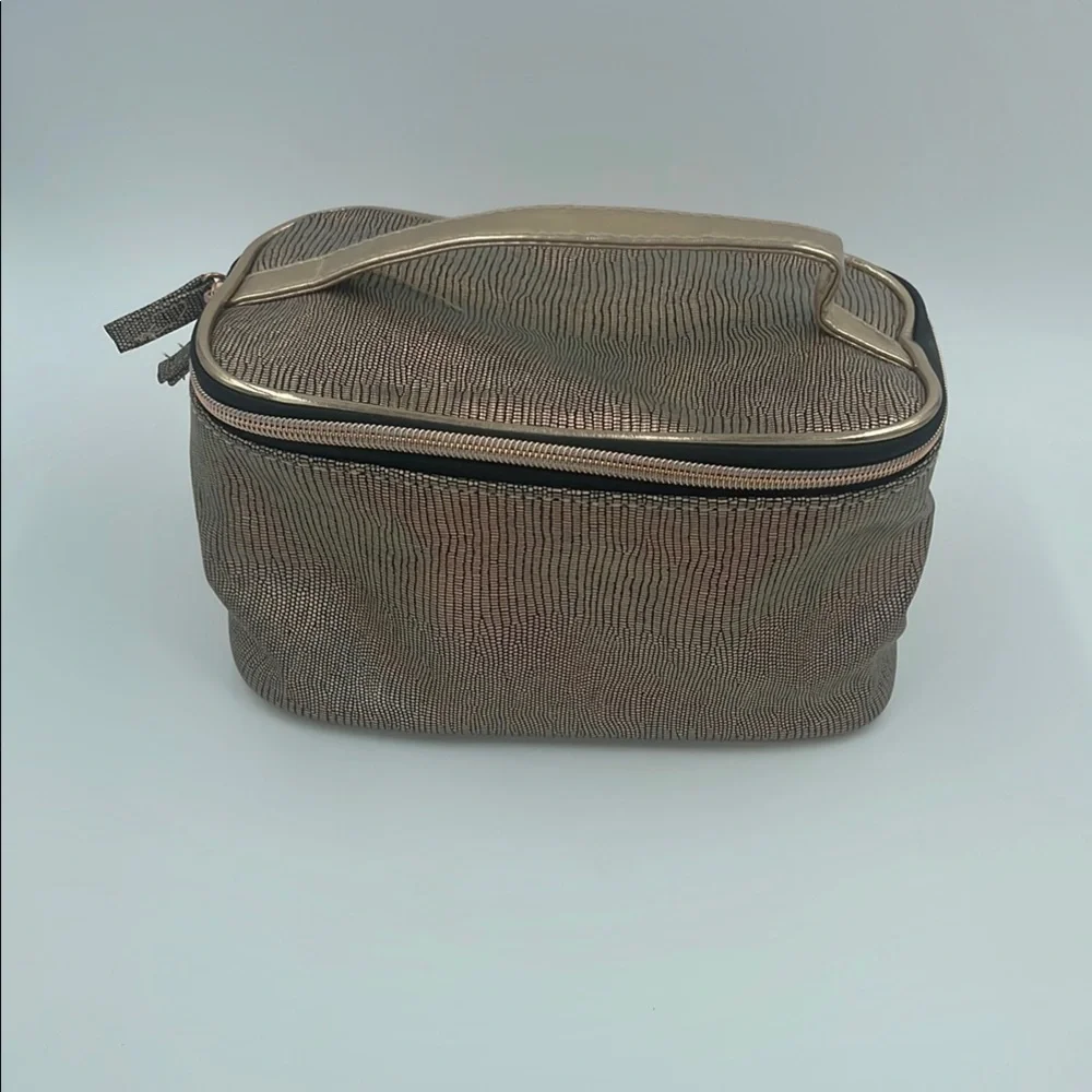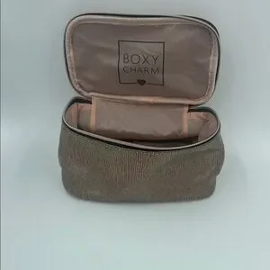 This is a BoxyCharm branded Train Case which is big enough to hold all of your makeup and skin care when you are travelling. It is an iridescent rose gold colour on the outside and has a pinky/peach satin lining inside.