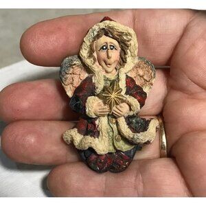 This Boyds Bears Folkwear Holiday Angel brooch features a charming design with a star pin. Perfect for holiday attire or as a collector's item, it brings a touch of festive spirit. Ideal for gifting or personal use.