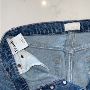These Boyish jeans feature a classic medium blue denim wash with a high-rise fit, offering a flattering silhouette. The denim's slightly textured appearance and subtle wear patterns add a touch of vintage charm, making them a versatile addition to any wardrobe.
