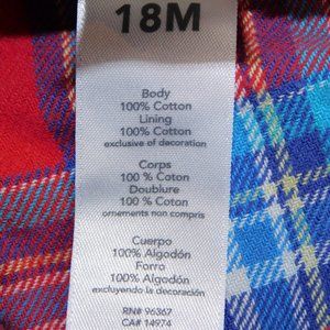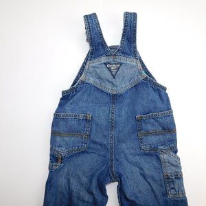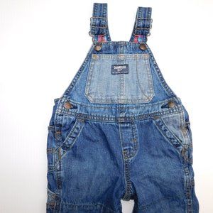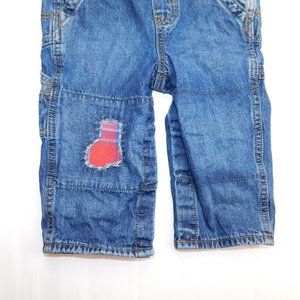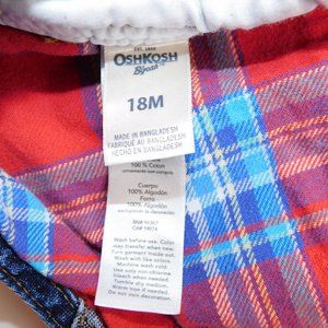 This pair of Boys 18 months Oshkosh B'gosh Flannel Lined Destressed Blue Denim Carpenter Overalls are in Excellent clean condition. Overalls are 100% Cotton. Machine washable. Features Red and Blue Flannel lining, adjustable straps and snap leg / crotch closure.