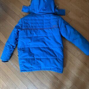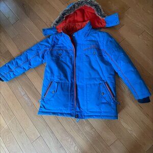 Boy's warm winter jacket, bright blue with orange fleece lining and detachable hood, by Free Country. Excellent condition.