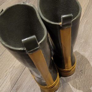 The cute rain boots are Hunter Green with yellow accents and laces.