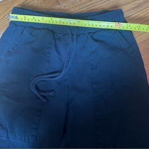 100% cotton black joggers track pants with cuffs turned up 1/2 inch. Full elastic waist. Drawstring that functions and ties to make the waist adjustable. Big side pockets. Inseam: 23 inches, waist 26 inches. Smoke- and pet-free home. Size 12-ish. Brand is unknown.