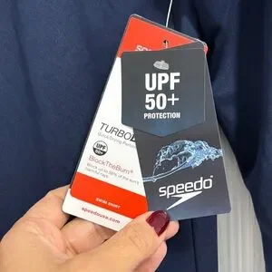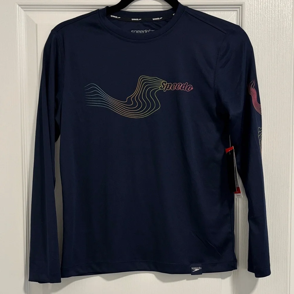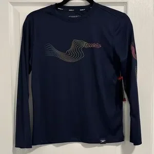 Dark blue long sleeve rash guard with wave design. Features Speedo logo. BNWT.