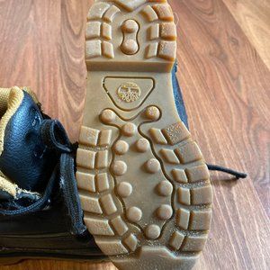 These hiker boots are warm. Size 7 toddler. Black with tan on the inside. Black laces and tan slip-resistant bottoms. Made from genuine leather and rubber which makes these boots very durable.