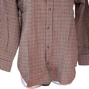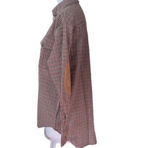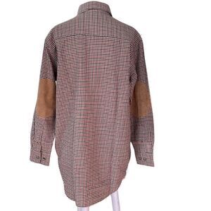Black and red check, cotton, faux suede patches on right shoulder, elbows and inside collar, long sleeve, button front, front flap pocket, longer in back than front, could fit larger than medium-check measurements, NWT, EUC, neck to hem at back 34”, armpit to armpit 24”, armpit to cuff 20”.