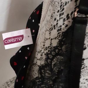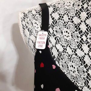 92% polyester, 8% spandex. Very nice smooth finish bra. Size 44D. Black with various coloured hearts. Lace back details.
