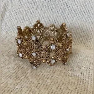 Gold coloured costume jewelry bracelet with white beads Stretchy elastic on the inside Purchased from Hudson’s Bay; no idea what materials it’s made of