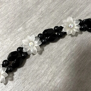 A dainty bracelet with double layer black glass beads and 3 Flower Swarovski Crystal embellished beads. Large clasp closure.