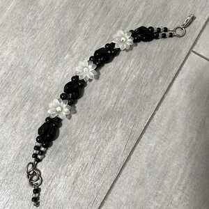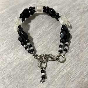 A dainty bracelet with double layer black glass beads and 3 Flower Swarovski Crystal embellished beads. Large clasp closure.
