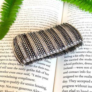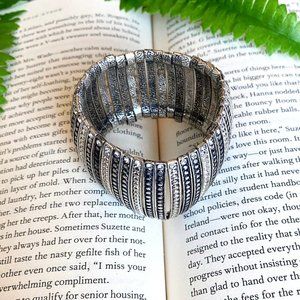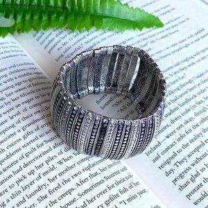 Silver color extendable bracelet with many rows of julienne metal pieces all adorned with dots patterns.