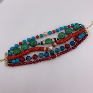 Bracelet, NWOT, 5 strand real turquoise, lapis, pearls, coral, statement, colour