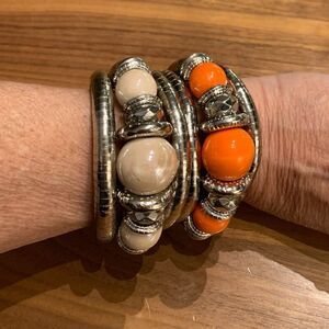 Just for the fun of it. Add colour and pizzazz to any ensemble any time of year. Silver toned coil bracelet, one size fits all, with silver beads and large ivory coloured beads. Selling as fashion jewellery but believed to be Tibetan silver-consignment find in excellent used condition with no damage, chips or wear detected. Gorgeous with summer or resort wear: hot with animal prints and/or favourite jeans. One in bright orange also available (listed and priced separately) to stack or mix and match with your favourite jewellery pieces. Add some completing pieces from Our Closet, (some suggestions shown all listed and priced separately), make a bundle, save a bundle. Fresh and Fun from Lemon Squeezy Shop🍋