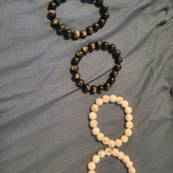 Two gold sheen obsidian bracelets, two white howlite bracelets and a Michael Kors crystal snap on silvertone bracelet