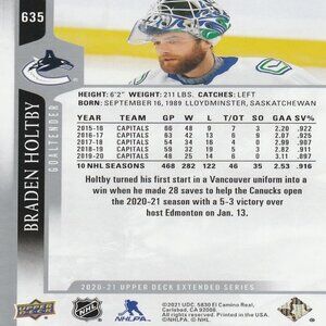 Braden Holtby (Vancouver Canucks) 2020/2021 Upper Deck Extended Series Hockey Card