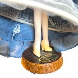 Gorgeous birthday sapphire doll by Bradley Dolls which were made in Korea and LA - new with tags, stamps, and stickers !!! Slight mark on mouth but otherwise excellent condition - hair is still in gorgeous curls - sapphire necklace and hand woven basket full of yellow roses for friendship. Shoes and stockings and underskirt - plastic hands - Comes boxed with hair net