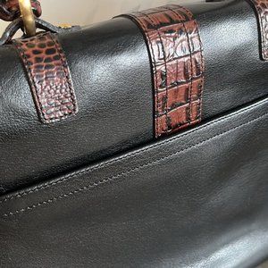 The Julia Rose satchel from Brahmin is made with a Black grained leather, and is adorned with Lady Tuscan brown croc-embossed trim. It features gold-tone metal hardware, a rolled top croc-embossed handle, an adjustable and detachable shoulder strap, a back magnetic slip pocket, an embossed gold-tone logo tag, and floral-motif tassels. The front flap is secured with a branded twist-lock closure, and opens to a taupe logo-pattern micro-suede lined interior that features dual interior compartments with a zip divider, two zip pockets, wall and cell phone pockets with pen loops, and a key clip.