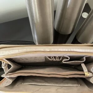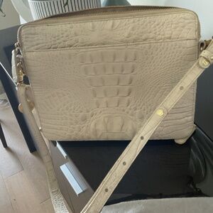 Cream, embossed leather Brahmin handbag with pocket for iPad or similar sized tablet on one side. The other side has 5 credit card spaces, three pen holders and a middle pocket. The outside has small magnetized flap pocket and a second pocket on the other size. This purse is very compact and great for traveling. It was used very seldomly so is in perfect condition.