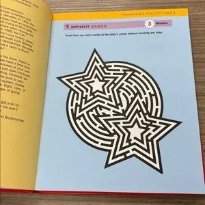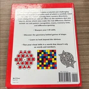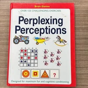 Brain Games Perplexing Perceptions book with challenging exercises. Red cover with colorful illustrations.