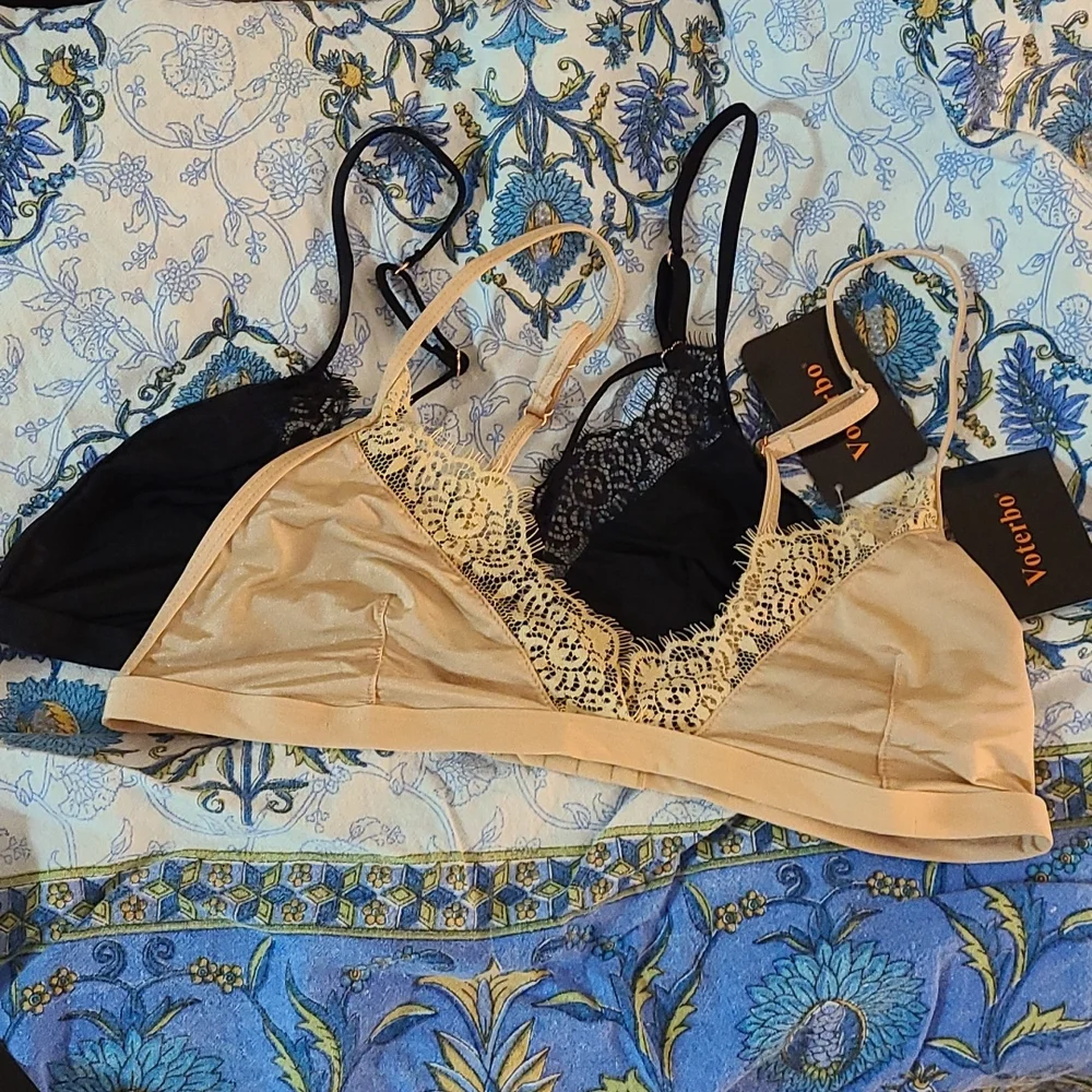 NWT. Made in Asia. Price is for both bralettes. Said to be a size large, would fit small/medium best with a B cup. I'm a 36C and these do not even cover. Tagged Victoria Secret for exposure.