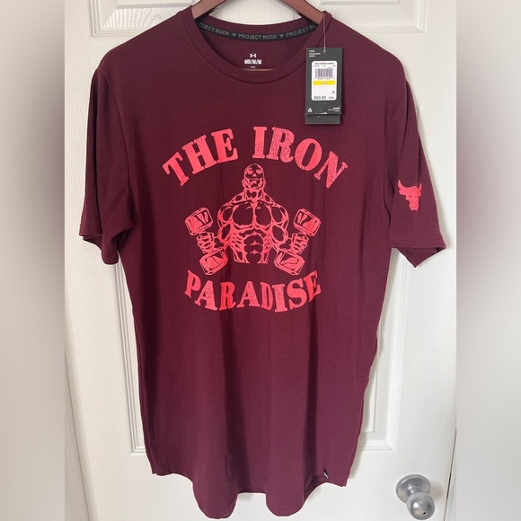 Brand new with tags Project Rock Dwayne Johnson Iron Paradise short sleeve workout t shirt medium. Measures 21.5” pit to pit with stretch to 22” and 30.5” top to bottom for an athletic fit! Beautiful maroon or burgandy colour way!