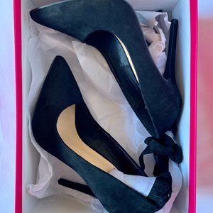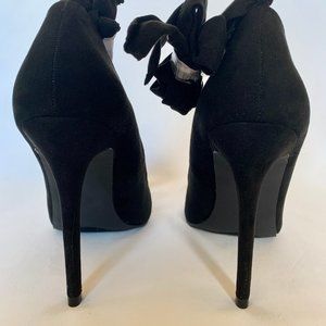 The classic pointed toe black pump with a twist. The ankle straps haven't even been unwrapped on this pair; they are brand new, never worn and come in their box. This faux suede pump has a 4.5" heel and fits best on a narrower foot.