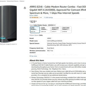 Brand new Arris Surfboard AX3000 G34 cable modem router combo for sale. Fast DOCSIS 3.1, gigabit Wifi 6, 3gbps 3000mbps max internet speeds, wi-fi, internet, Surf Board wired and wireless networking, ethernet.