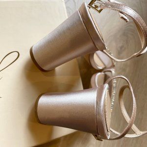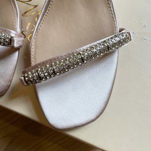 Colour : champagne (the colour of the fabric is somewhere in between light pink and light gold). The stone decoration is somewhere between gold and silver but looks a bit more silver to me.