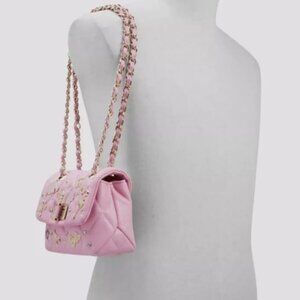 Pink crossbody barbie bag by Aldo. Pink quilted material with golden pin accents on front of bag.