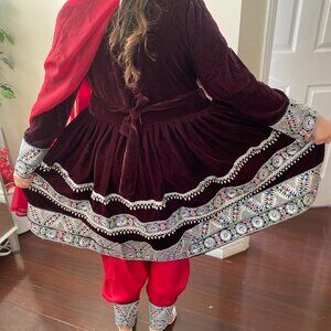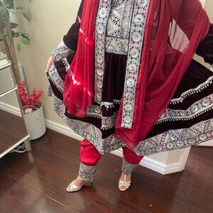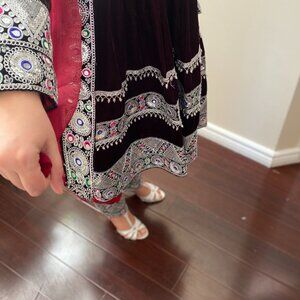 The traditional Afghan dress is crafted from high-quality velvet fabric in a rich burgundy color. It is meticulously hand-made with superior stitching and materials. The burgundy velvet dress is enhanced with an additional color of silver, featuring intricate Mirror embroidery for added detail.