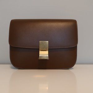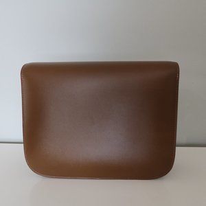 CELINE medium classic bag in box calfskin in camel with an adjustable and removable leather strap and a metallic clasp closure