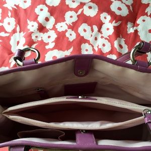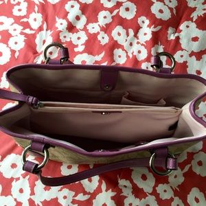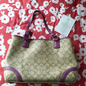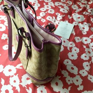 This is a beautiful authentic and brand new Coach bag. It has khaki and lavender coloring on the outside, with a stunning blush colored inside lining. This has never been used and still includes the packaging on the inside to give it its structure! Reasonable offers are more than welcome!