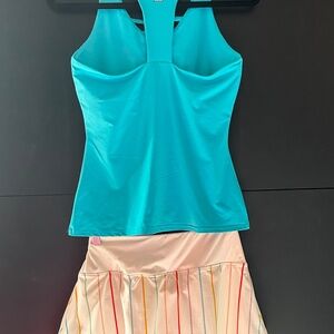 Fun and colourful outfit. Top is a 2025 Fila Essential in Scuba Blue colour with self-bra. Skort in Ivory with multi colour stripes. Perfect for tennis or pickleball